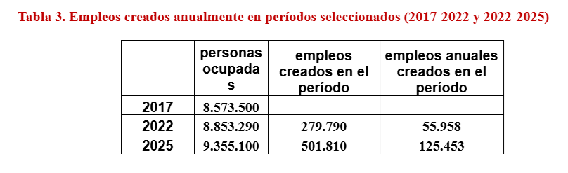 El 70% llegó después de 2017. Asimismo, hay voces que culpan al gobierno actual de los problemas de empleo. Las cifras de la tabla 3, basadas en fuentes oficiales del INE, parecen indicar que el proceso real de creación de empleos desde 2022 pudo evitar un colapso mayor que produjo la masiva migración.