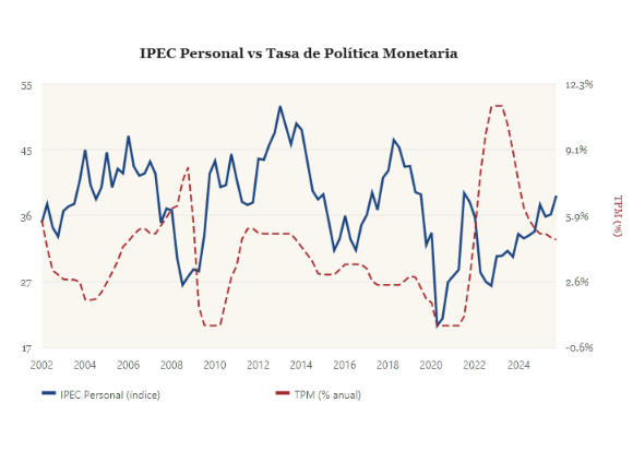 Un hallazgo relevante en la perspectiva Bienestar que inspira a este boletín es la correlación entre el Indice de percepción económica (IPEC) personal (una variable apropiada para medir el bienestar subjetivo) y la tasa de política monetaria (TPM) La política monetaria impacta la percepción de bienestar principalmente a través del mercado laboral: cuando sube la TPM, el empleo y los salarios reales se contraen, deteriorando especialmente la percepción económica personal de los hogares hand-to-mouth y viceversa. El gráfico siguiente es elocuente en este sentido.