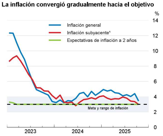 Asimismo, las expectativas económicas de inflación medidas por el Banco Central para 2025 y 2026 desde marzo de 2025 se sitúan sin cambios en 4% y 3%, respectivamente.