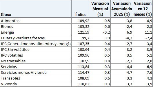 Como indica el informe del INE en septiembre de 2025, el Indice de precios al consumidor (IPC) alcanzó a 0,4% en el mes, acumulando 3,3% en el año y 4,4% a doce meses en septiembre de 2025.