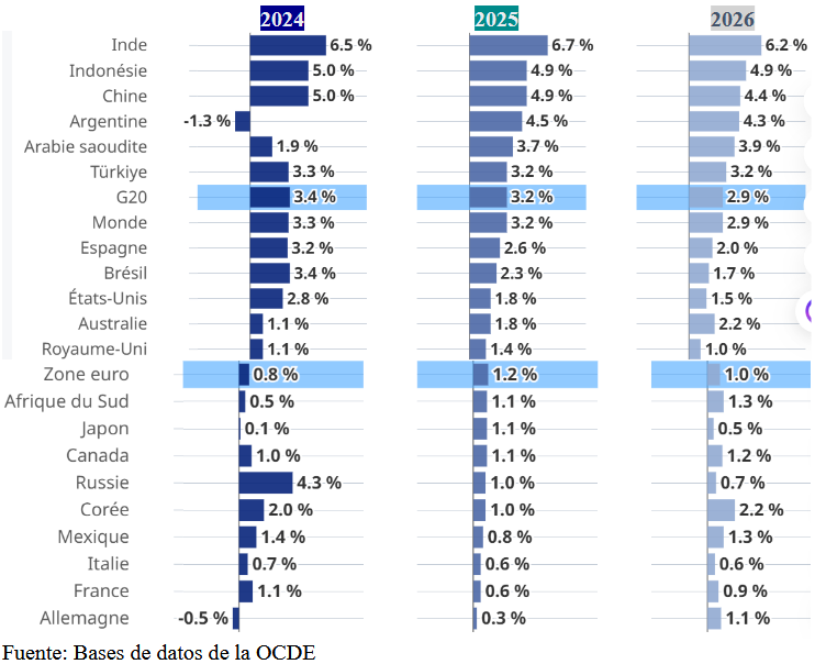 Este informe de Perspectivas económicas publicado por la OCDE estima que: “el crecimiento del PIB mundial se desacelere del 3,3 % en 2024 al 3,2 % en 2025 y al 2,9 % en 2026, a medida que el aumento de los aranceles y la persistente incertidumbre vinculada a la acción política frenan la inversión y el comercio.
