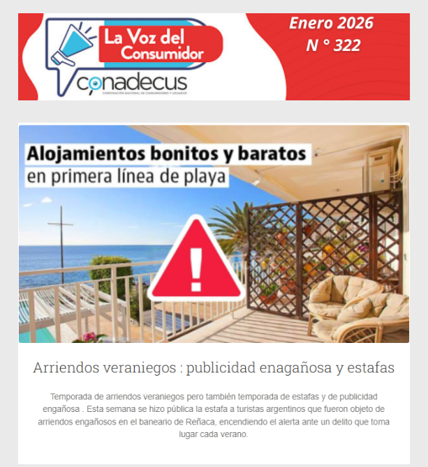 Cada semana el boletín de Conadecus, La Voz del Consumidor, reúne un compendio con las principales noticias sobre consumo, economía, y ley del consumidor para mantenerte informado y en alerta. Cada viernes en tu bandeja de entrada y en conadecus.cl. Suscríbete y mantente al día en los temas que nos interesan y nos involucran.