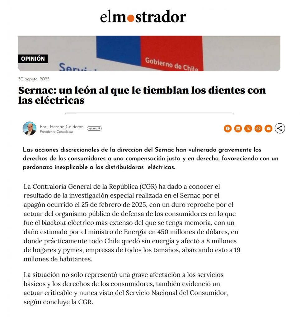 Te invitamos a leer la más reciente columna de opinión escrita por el presidente de Conadecus, Hernán Calderón, y publicada en elmostrador.cl, dedicada a repasar la escandalosa trayectoria del Sernac en el marco del gran apagón energético del 25 de febrero de 2025.