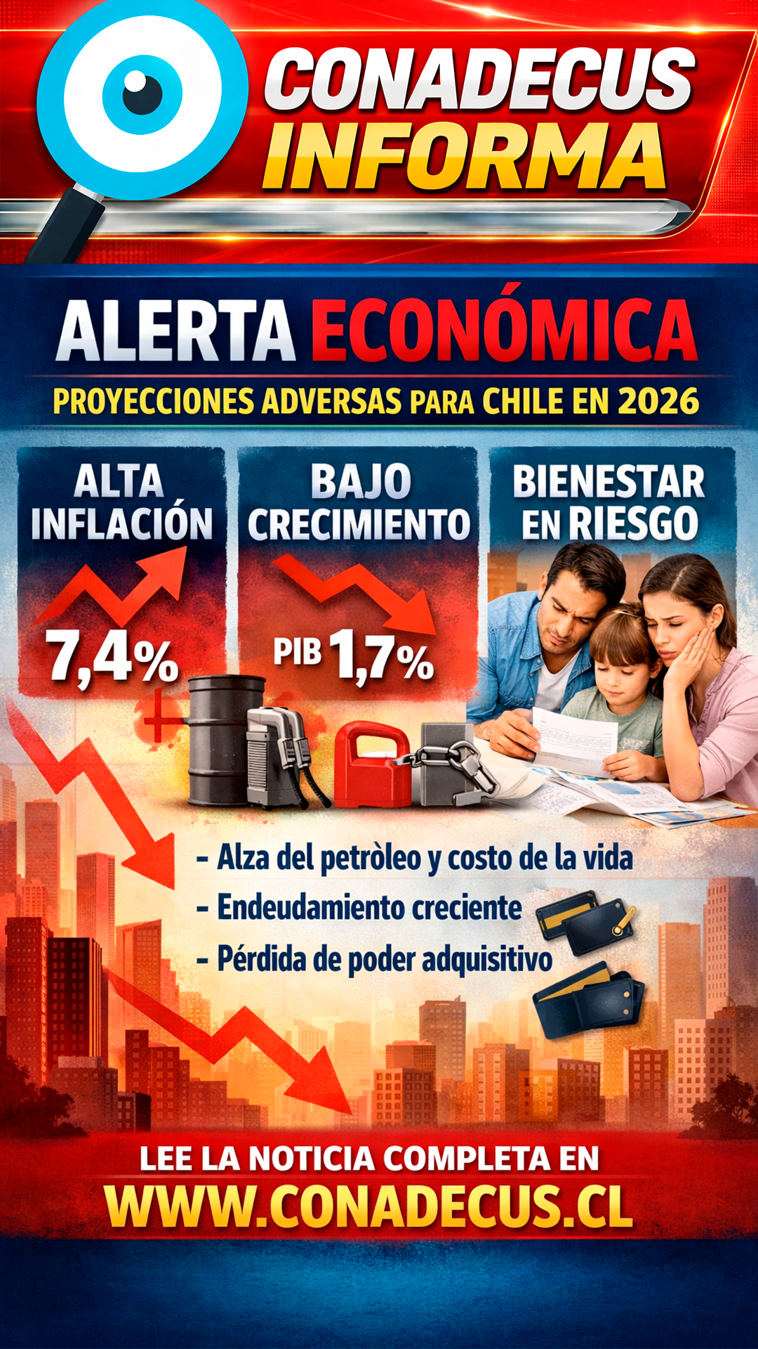 La Corporación Nacional de Consumidores y Usuarios de Chile (CONADECUS) ha manifestado su profunda preocupación ante las recientes estimaciones macroeconómicas para el año 2026. Según informes de equipos académicos en economía aplicada, el país enfrenta un panorama complejo caracterizado por presiones inflacionarias y un bajo crecimiento económico, lo que impactaría directamente en la calidad de vida de las familias chilenas.