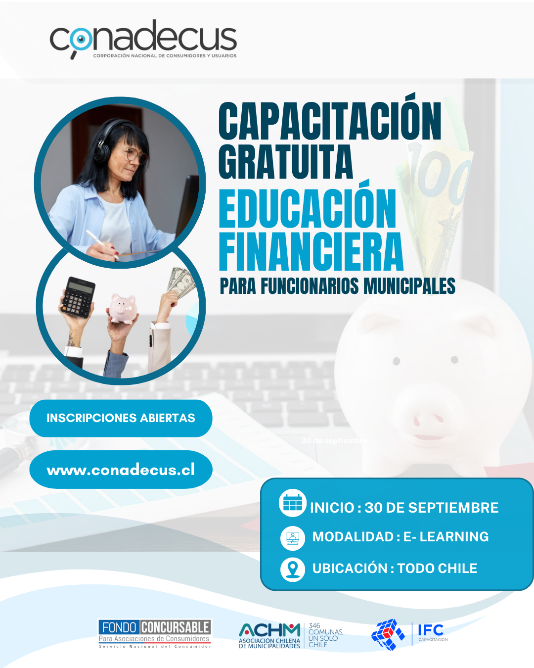En una más de sus numerosas iniciativas educativas destinadas a prevenir el sobreendeudamiento y, a promover conductas de consumo responsable entre las comunidades, La Corporación de Nacional de Consumidores y Usuarios CONADECUS, junto a la Asociación Chilena de Municipalidades ACHM, y el Instituto Financiero de Capacitación IFC, llevará a cabo una nueva edición del curso de Capacitación Educación Financiera para funcionarios municipales de todo Chile, a partir del 30 de septiembre al 30 de octubre, en formato E – Learning, gratuito.