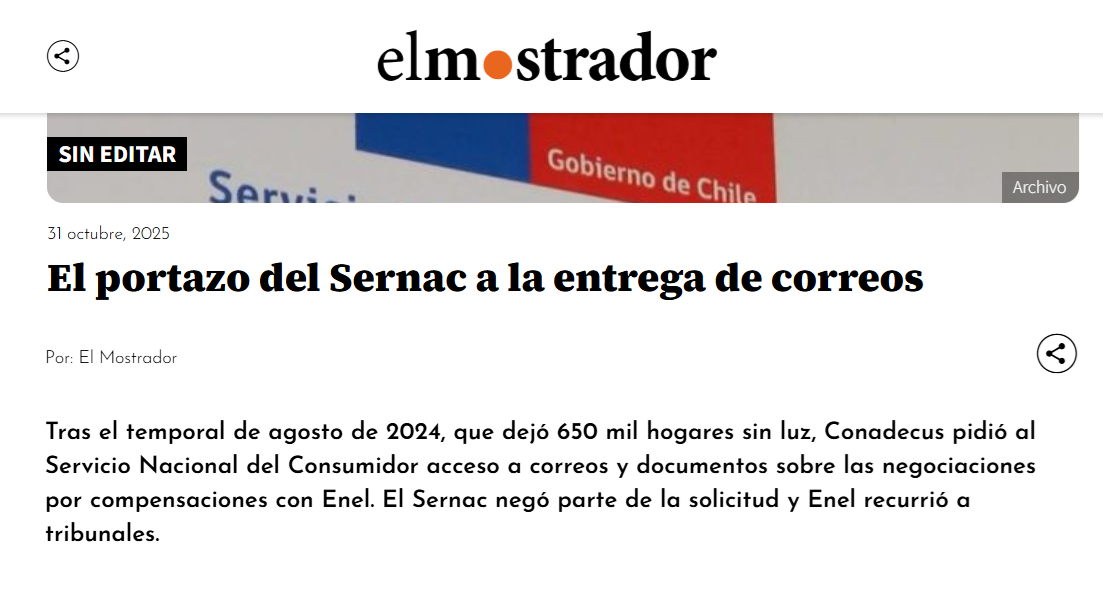Tras el temporal de agosto de 2024, que dejó 650 mil hogares sin luz, Conadecus pidió al Servicio Nacional del Consumidor acceso a correos y documentos sobre las negociaciones por compensaciones con Enel. El Sernac negó parte de la solicitud y Enel recurrió a tribunales.