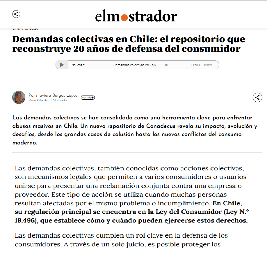 El Mostrador conversó con la abogada del equipo juridíco de Conadecus, Camila Huispe, una de las impulsoras del recientemente implementado repositorio virtual jurisprudenciadeconsumo.cl, el primer buscador que reúne más de dos décadas de demandas colectivas iniciadas en Chile desde 2004 hasta la actualidad. Una investigación de larga data que se propuso destacar la importancia de esta herramienta jurídica fundamental en el marco legal de La Ley del Consumidor y en la defensa de los derechos de los consumidores en el Chile reciente.