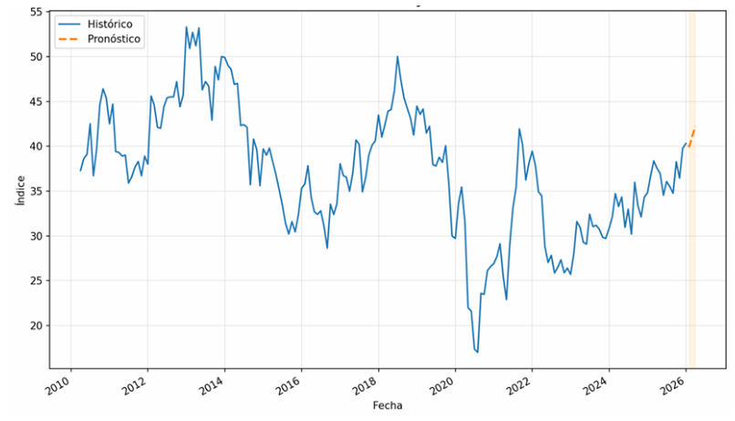 El gráfico 1 muestra el registro histórico del índice de bienestar y las proyecciones de APROB para los primeros tres meses de 2026 (en rojo en la gráfica).