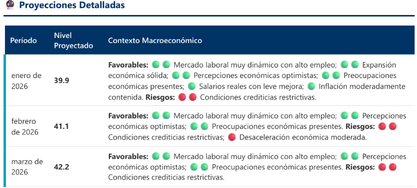 En suma, como se visualiza en la gráfica, el escenario PBE‑APROB sugiere una mejora gradual del bienestar en los próximos meses, apoyada en un mercado laboral relativamente firme, presiones de precios a la baja y percepciones algo más optimistas. No obstante, persisten focos de cautela, especialmente asociados al comportamiento del crédito a los hogares y a la dinámica de la actividad económica.