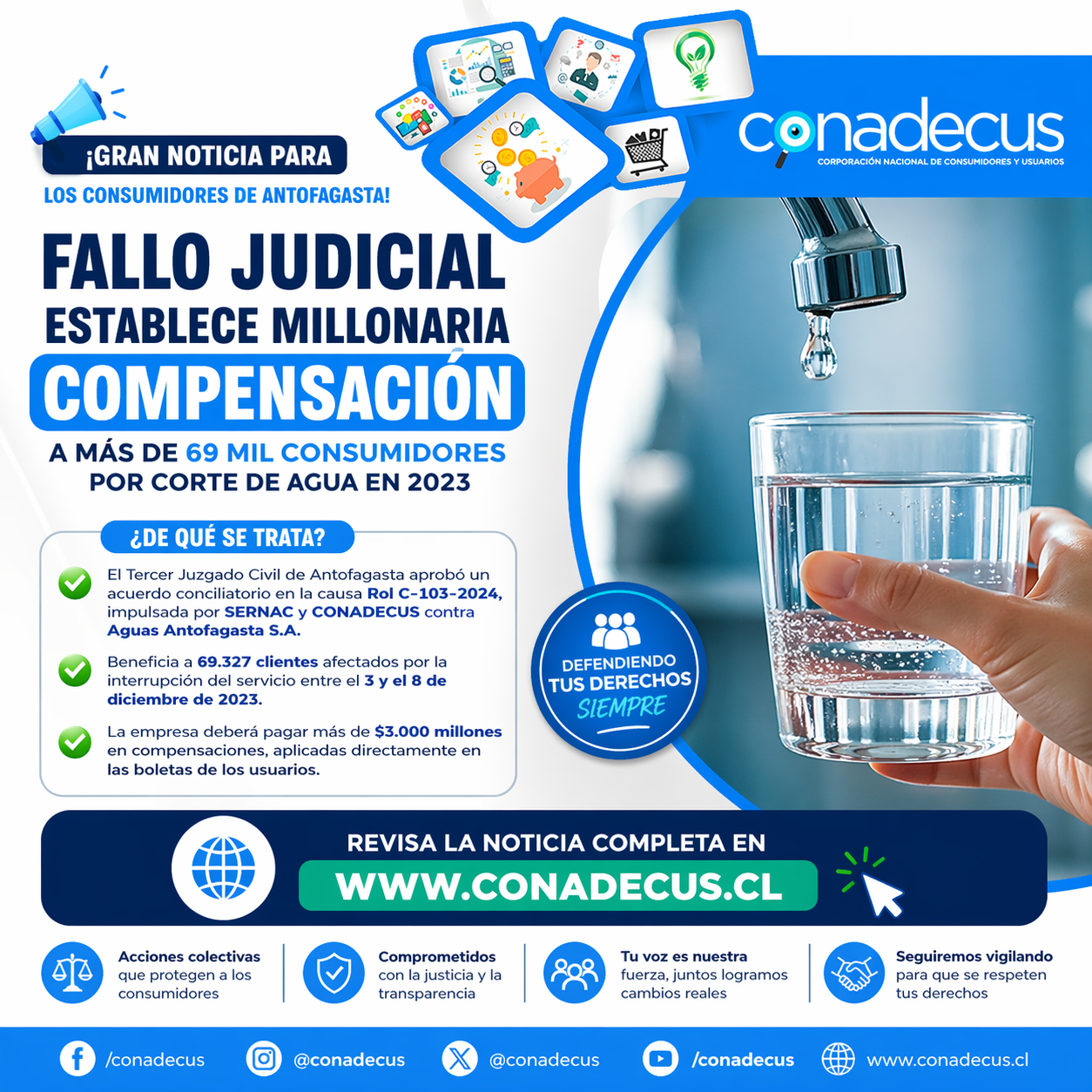 El Tercer Juzgado Civil de Antofagasta dictó una resolución histórica al aprobar un acuerdo conciliatorio en el marco de la causa Rol C-103-2024, derivada de la demanda colectiva contra la sanitaria Aguas Antofagasta S.A.. Esta acción judicial fue impulsada por el Servicio Nacional del Consumidor (SERNAC) y la Corporación Nacional de Consumidores y Usuarios (CONADECUS), tras la interrupción masiva del suministro de agua potable que afectó a la comuna entre el 3 y el 8 de diciembre de 2023. Durante el proceso, CONADECUS sostuvo que dicha suspensión constituyó una infracción a la Ley de Protección de los Derechos de los Consumidores (LPDC), al no garantizarse la continuidad de un servicio básico esencial.