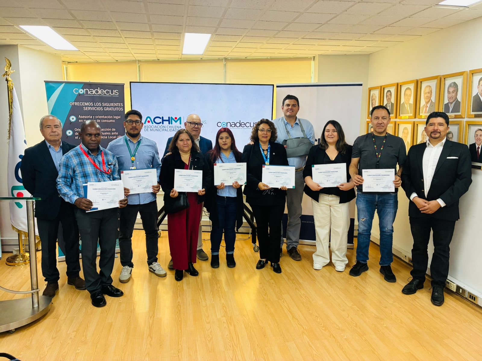 Con la presencia de funcionarios pertenecientes a diversos municipios de la región metropolitana y del país, como Pedro Aguirre Cerda, Recoleta, Macul, Renca, San José de Maipo, y Calle Larga de Los Andes.La mañana de este lunes 10 de noviembre, en la sede de la Asociación Chilena de Municipalidades ACHM, se llevó a cabo la ceremonia de cierre y entrega de diplomas certificados del programa de Capacitación gratuita y en formato E-Learning; Educación Financiera y Derechos de los Consumidores, dirigida a funcionarios municipales a lo largo de todo el país.