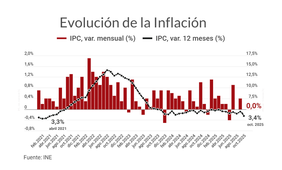 El Índice de Precios al Consumidor (IPC) de octubre registró una variación mensual de 0,0%, informó el Instituto Nacional de Estadísticas (INE), sorprendiendo al mercado que esperaba un alza de entre 0,2% y 0,3%.