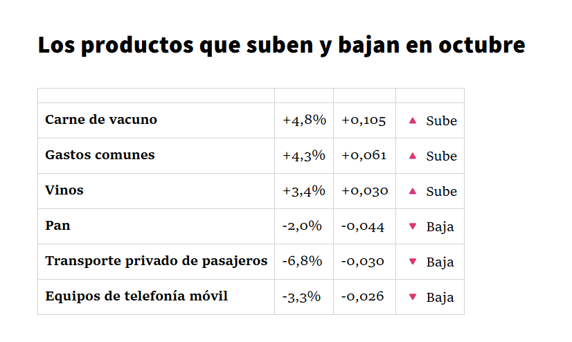 Otros productos que destacaron en el mes fueron los gastos comunes (4,3%), el vino (3,4%) y el pan, que registró una caída de 2,0%. El transporte privado de pasajeros, en tanto, bajó 6,8%, aportando -0,03 puntos porcentuales a la variación general.