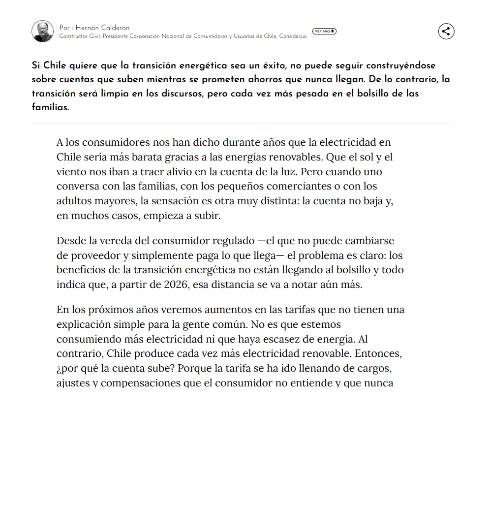 Si Chile quiere que la transición energética sea un éxito, no puede seguir construyéndose sobre cuentas que suben mientras se prometen ahorros que nunca llegan. De lo contrario, la transición será limpia en los discursos, pero cada vez más pesada en el bolsillo de las familias.