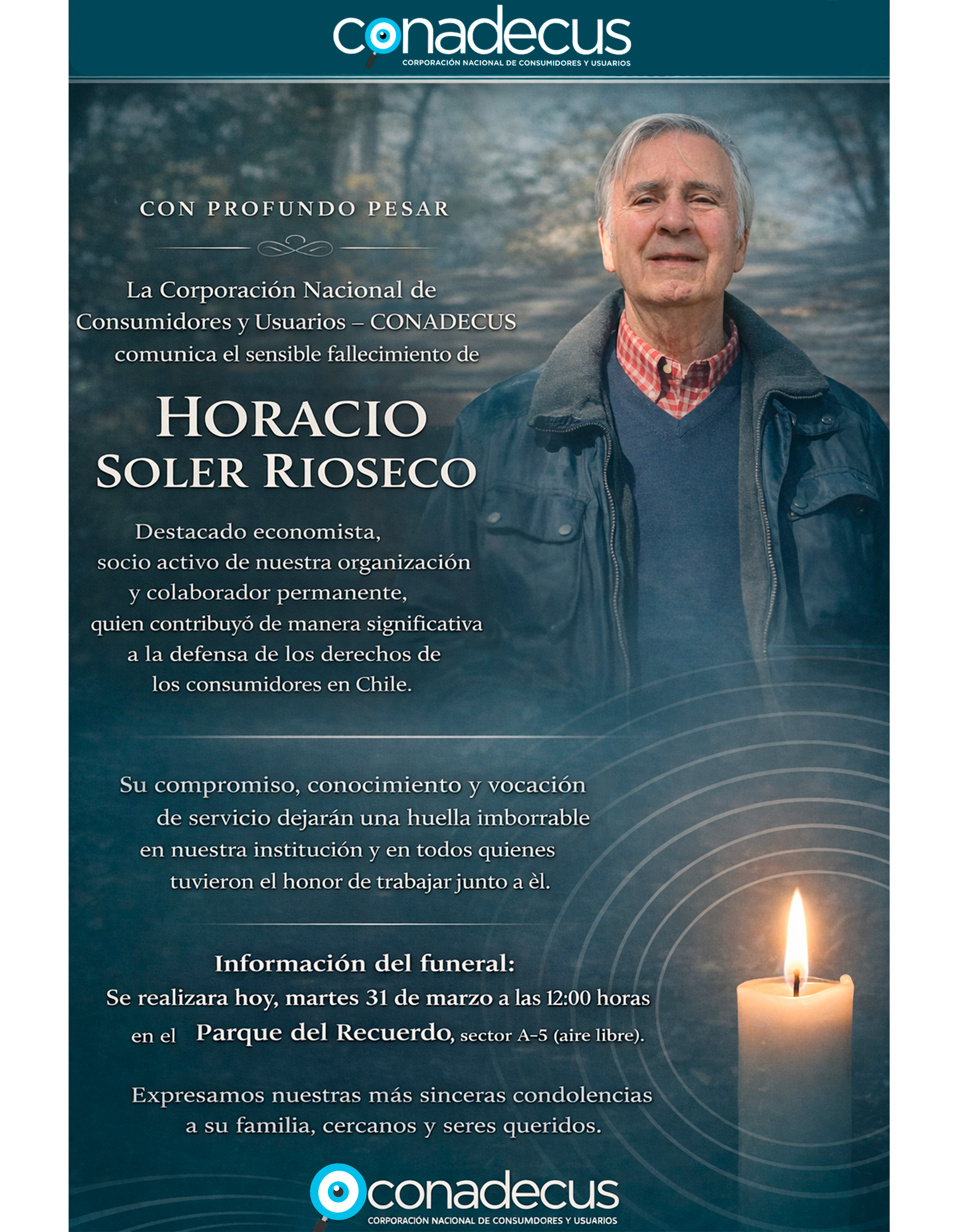 SANTIAGO – Con profundo pesar, la Corporación Nacional de Consumidores y Usuarios (CONADECUS) informó el sensible fallecimiento de Horacio Soler Rioseco, destacado economista y una de las figuras clave en el activismo por la transparencia y la justicia en el mercado nacional.