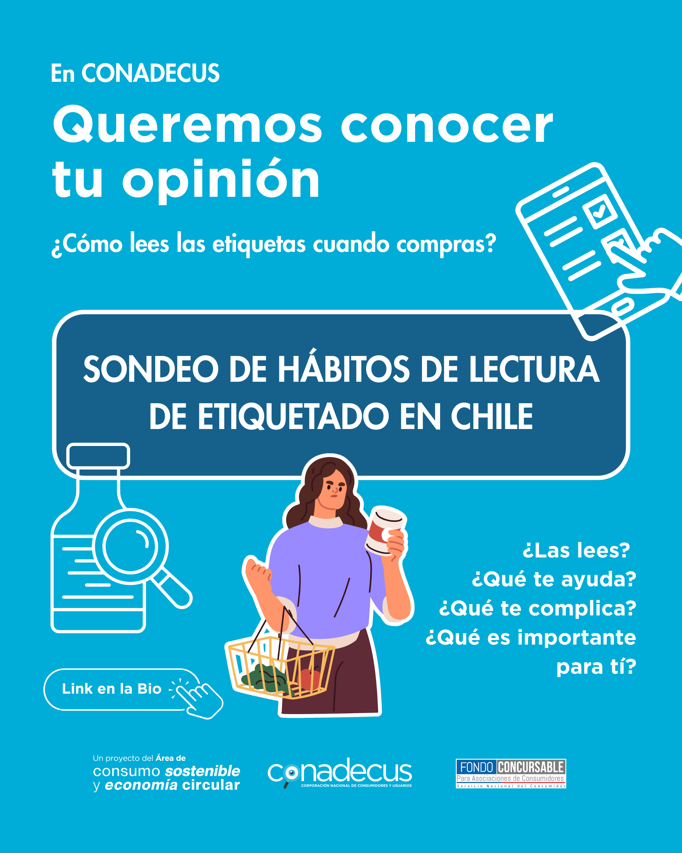 Buscando descifrar los hábitos de las personas consumidoras al momento de leer las etiquetas en los productos, en CONADECUS, a través de nuestra área de Consumo Sostenible y Economía Circular, hemos implementado el Sondeo de Hábitos de Lectura de Etiquetado en Chile, encuesta dirigida a toda la ciudadanía, de modalidad totalmente online y, cien por ciento confidencial, ya disponible aquí, y en nuestras redes sociales, la cual podrá ser contestada hasta el 7 de noviembre.